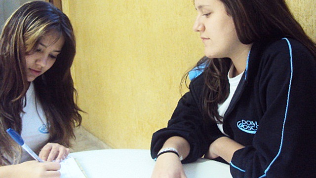 “No 2B, estamos com a professora de Inglês, Sabine e o Ed, de Biologia.”